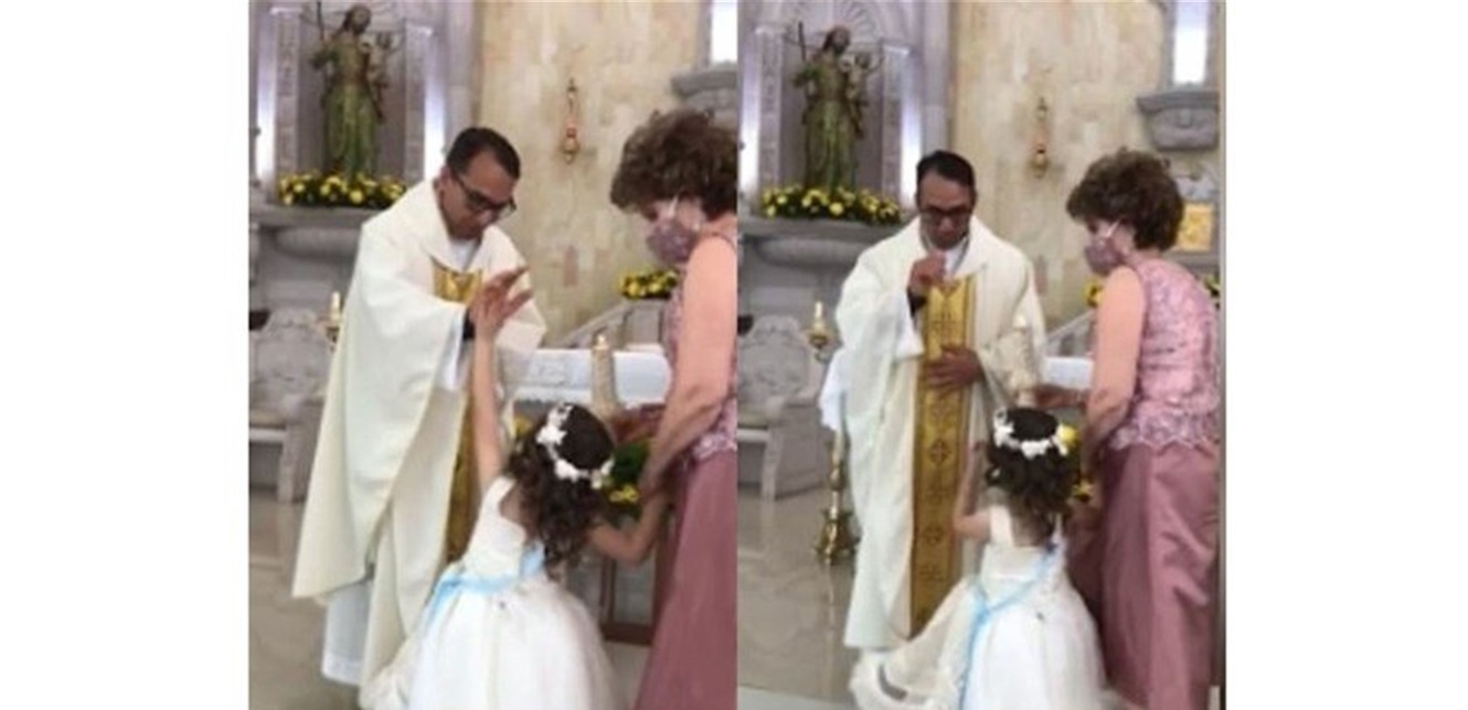 ومن خلال الفيديو، فيمكن رؤية اللحظة التي رفع خلالها الكاهن يده فوق رأس الطفلة، إلا أن الأخيرة البالغة من العمر 5 سنوات رفعت يدها وصافحته.