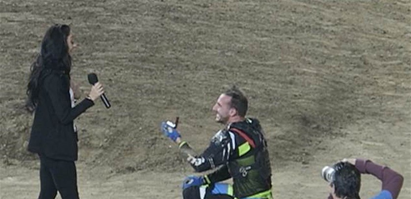 بعد بدء سباقه الأول، لفّق سائق دراجة نارية حادثة سقوطه ليتمكن من عرض الزواج على حبيبته أمام الحشود، بما في ذلك عائلتها.