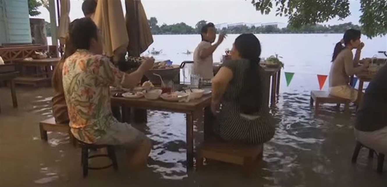 أصبح مطعم "تشاوبرايا أنتيك" في نونثابوري قرب العاصمة التايلاندية بانكوك نقطة جذب للعديد من السياح وذلك بعد أن غمرته المياه بارتفاع منسوبها في نهر محلي نتيجة الأمطار.