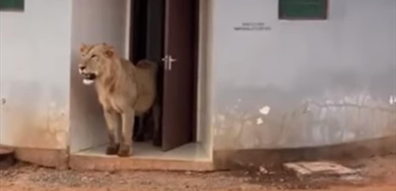أسد يختبىء في مرحاض عام بانتظار فريسة! (فيديو)