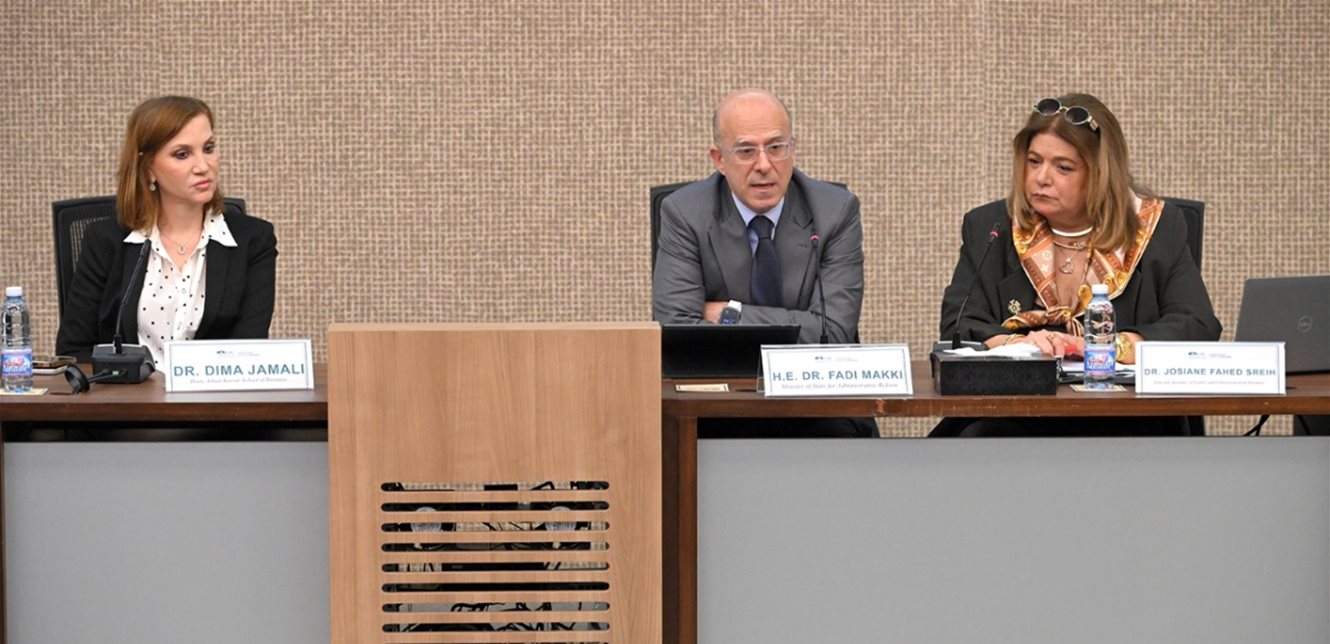 واعرب وزير الشؤون التنمية الإدارية الدكتور فادي مكي عن اعجابه بما تقوم به كلية عدنان القصار لإدارة الاعمال من مبادرات، وتذكر إطلاق وزارة التنمية الإدارية "مشروع إعادة إعادة تكوين إدارات ومؤسسات الدولة 2030" من الجامعة اللبنانية الاميركية وردود افعال الطلاب والخبراء والاكاديميين حول نوع الحكومة والمؤسسات التي يريدها اللبنانيون وأمالهم وامانيهم وتوقعاتهم من الادارة اللبنانية. واشار الى "ان المشروع الذي انطلق من الجامعة شمل أكثر من 80 موقعاً في جميع انحاء