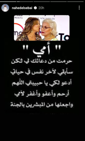 "، على موقع التواصل الاجتماعي "إنستغرام"، نشرت ناهد السباعي، صورة تجمعها بوالدتها، وعلقت عليها قائلة: "أمي حرمت من دعائك لي ولكن سأبقي لآخر نفس في حياتي أدعو لك ياحبيبتي"، وتابعت قائلة: "اللهم ارحم واعف واغفر لأمي واجعلها من المبشرين بالجنة".