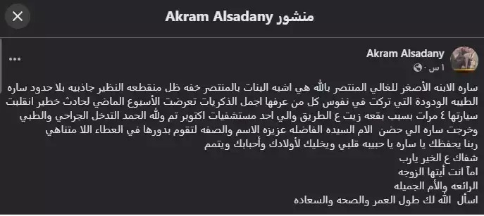 ، عن تعرض سارة ابنة الفنان الراحل المنتصر بالله، لحادث سير مروع