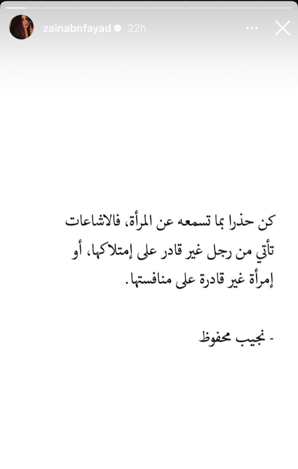 "كن حذراً بما تسمعه عن المرأة، فالاشاعات تأتي من رجل غير قادر على امتلاكها، أو امرأة غير قادرة على منافستها."