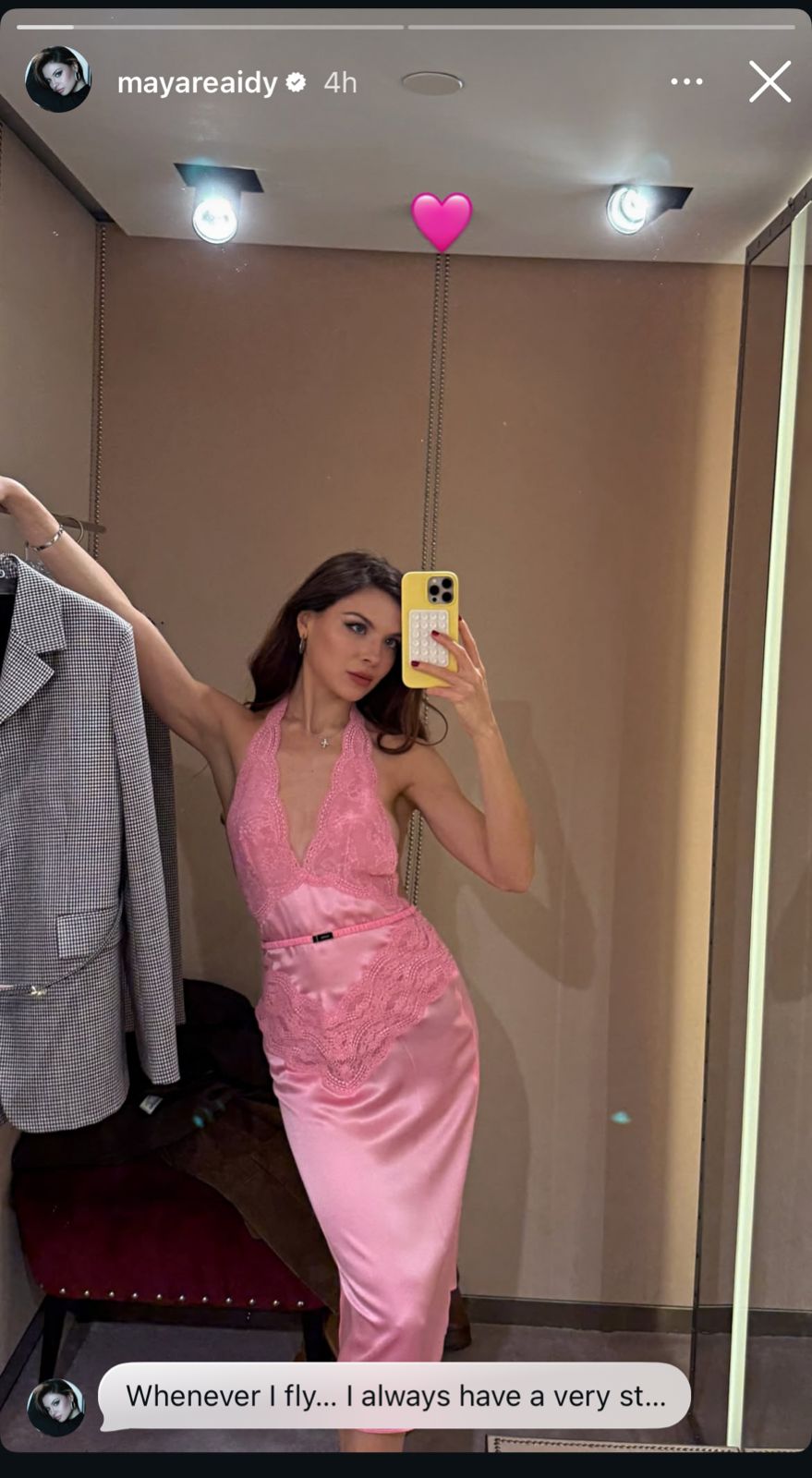 متابعيها عبر خاصية "الستوري" على حسابها الرسمي في إنستغرام، صورة من داخل غرفة تبديل الملابس خلال تجربة فستان حريري باللون الزهري، تميز بتصميم أنثوي جريء من الدانتيل والساتان.