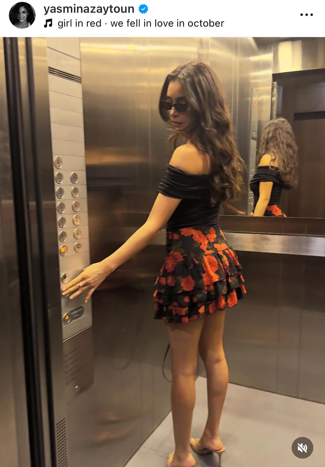 صورة جديدة على حسابها الرسمي في إنستغرام، تظهر فيها بإطلالة أنيقة داخل مصعد، مرتدية "بلوزة" سوداء مكشوفة الكتفين وتنورة قصيرة متعددة الطبقات ذات نقوش زهرية باللونين الأحمر والأسود. وأكملت اللوك بنظارات شمسية عصرية، مما أضفى عليها لمسة من الجرأة والأناقة.