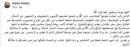 وتابعت: " والفنانة كانت زوجة لزميل محترم رئيس محكمة و ابنتها مستشارة لها مستقبلها الرائع بأذن الله و على فكرة هي سيدة اعمال ناجحة و بتنتج، يعني لا محتاجة تعمل كده علشان حد ولا علشان فرصة عمل في وسط التمثيل الذي لا يغني ولا يسمن من جوع هي في غنى عن ذلك، و بعدين دي أمور خاصة فقط بين الشخص وربه تخلع حجاب او تلبسه خليكوا بس في نفسكم يا ملائكة الأرض".