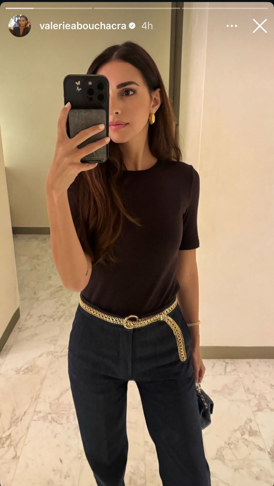 صورة حديثة عبر حسابها على مواقع التواصل، ظهرت فيها بإطلالة أنيقة وهادئة اعتمدت خلالها توبًا أسود ضيّقًا وسروالًا داكنًا، وزيّنتهما بحزام ذهبي لافت أضفى لمسة فاخرة على اللوك. كما اختارت أقراطًا ذهبية دائرية ونسّقت حقيبة صغيرة بستايل كلاسيكي.