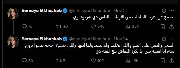 عن استيائها من تفشي السحر والحسد بين بعض الأشخاص، عبر تغريدة نشرتها على حسابها في موقع "إكس".