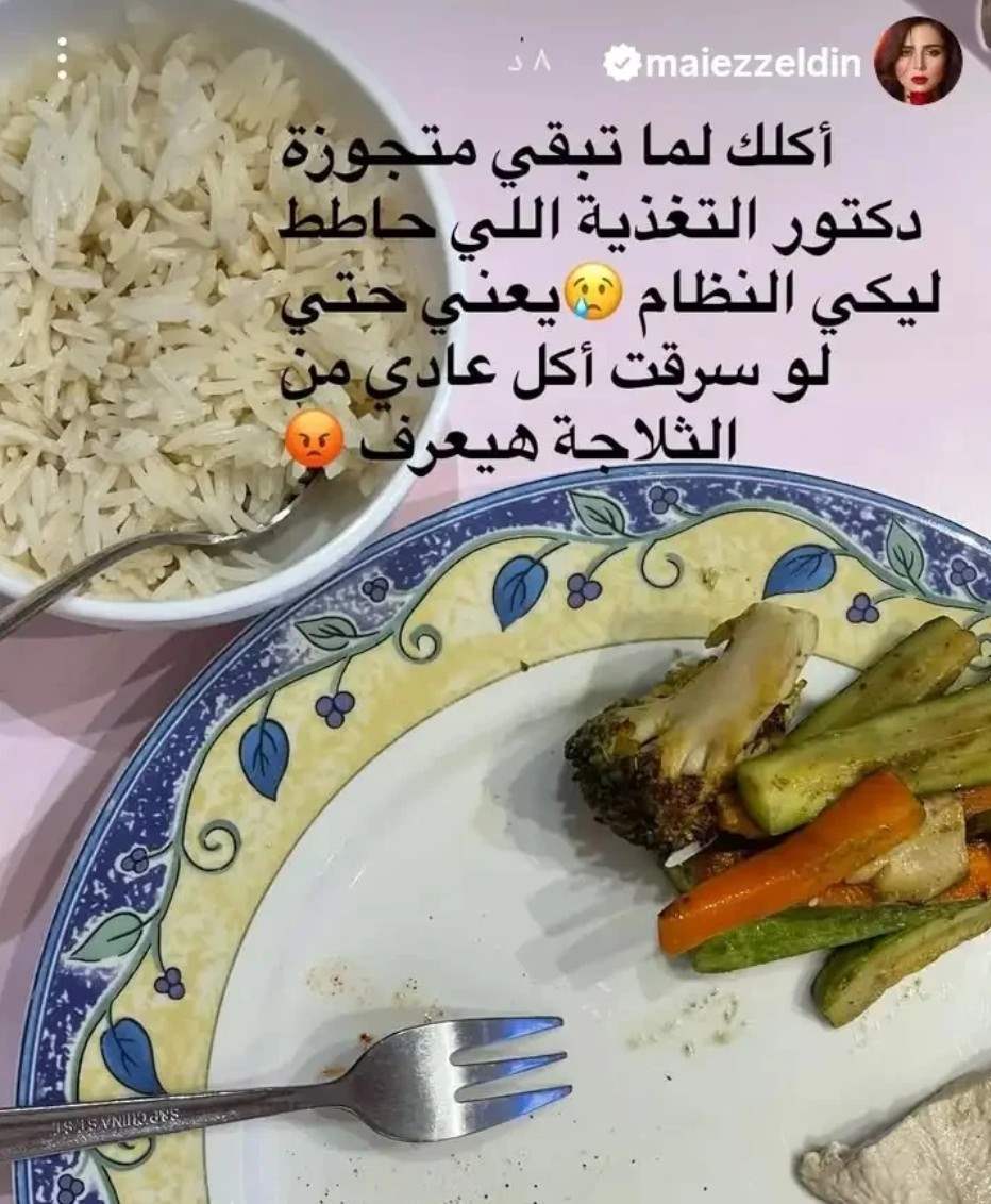 وعلقت مي على الصورة التي تكشف جزءاً من البرنامج الغذائي الذي وضعه لها زوجها، قائلةً: "أكلك لما تبقي متجوّزة دكتور التغذية اللي حاطط ليكي النظام... يعني حتى لو سرقت أكل من التلاجة هيعرف".