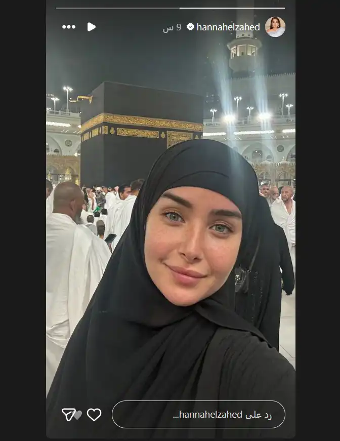 عبر خاصية "الستوري على "إنستغرام"، صورة بالحجاب من أمام الكعبة المشرفة أثناء تأديتها مناسك
