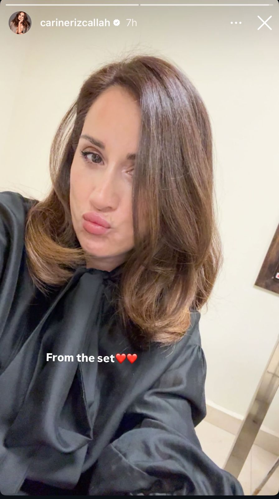 صورة جديدة عبر خاصية "الستوري" على حسابها الرسمي في "إنستغرام"، ظهرت فيها بإطلالة أنيقة وتركت تعليقًا بسيطًا قال: "From the set" مع قلبين أحمرين، في إشارة إلى تصويرها الحالي لأحد مشاريعها الفنية.