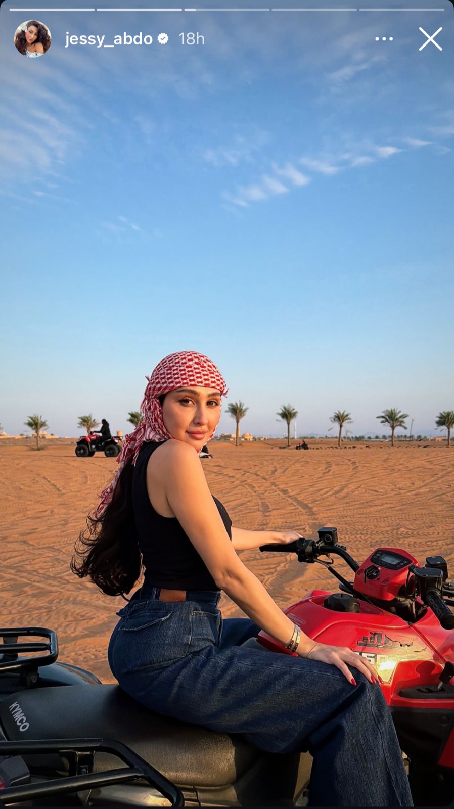 بعد نشرها صورة جديدة عبر خاصية «القصص» على حسابها في إنستغرام، ظهرت فيها خلال جولة ترفيهية في الصحراء وهي تقود دراجة رباعية وسط أجواء طبيعية مفتوحة.