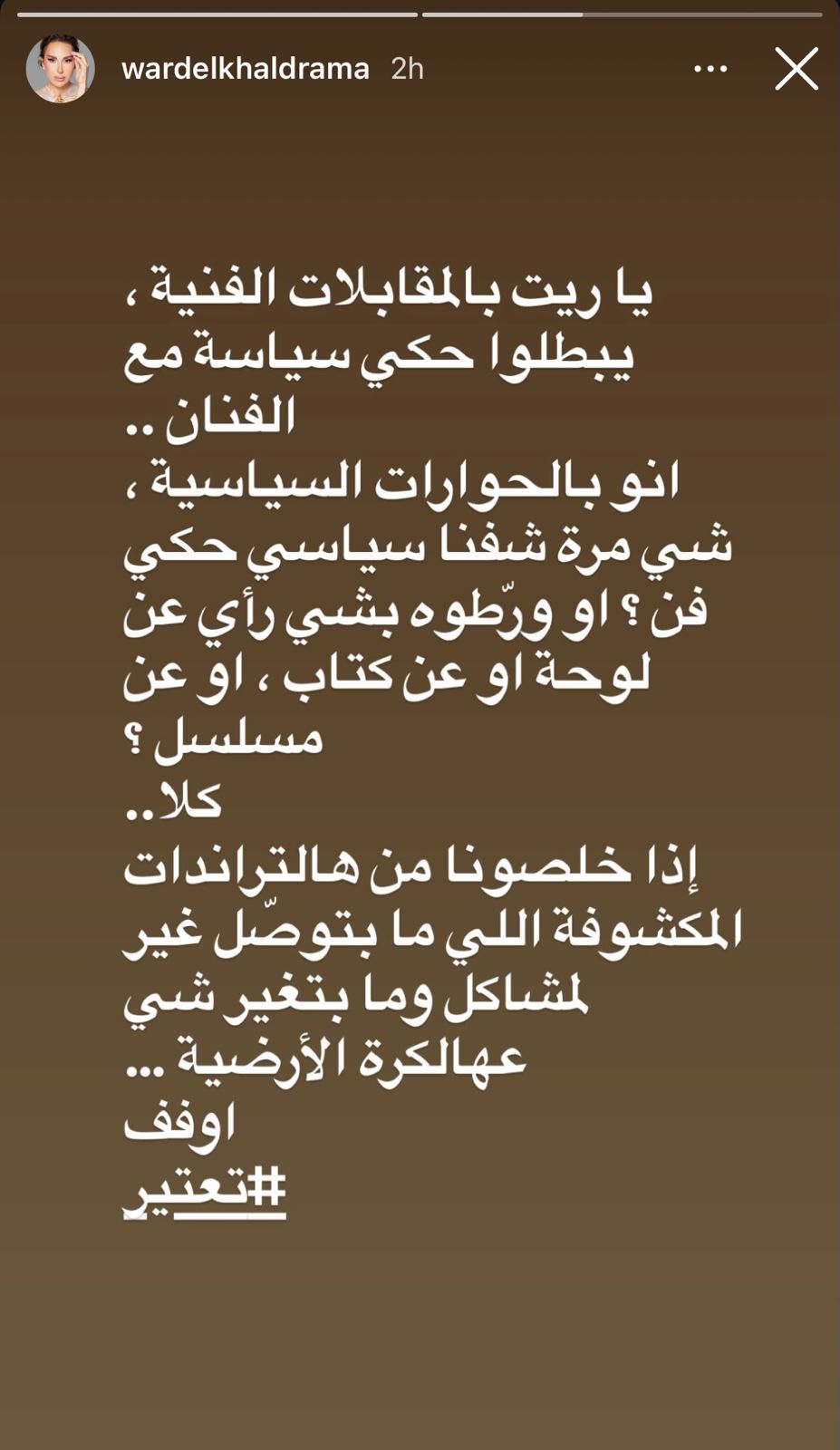 عبر خاصية القصص على إنستغرام تعليقًا تنتقد فيه إجراء المقابلات الفنية التي تتناول السياسة مع الفنانين، مشيرة إلى أن الحوار السياسي لا يجب أن يُطرح في مقابلات فنية، لأنها ليست المكان المناسب للحديث عن السياسة أو إبداء الآراء السياسية أو تناول اللوحات والكتب والمسلسلات. ودعت إلى التخلص من هذه الترانزات غير المفيدة التي لا تؤدي إلى حل مشاكل بلدانهم أو تغيير الأوضاع، مطالبة بوقف هذا الأسلوب.