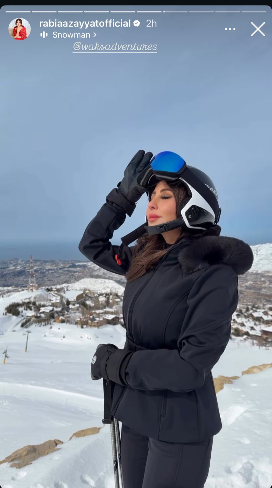 مرتدية لباسًا أسود مخصصًا للتزلج مع خوذة ونظارات واقية، عاكسةً أناقة لافتة وانسجامًا مع الأجواء الشتوية، وبدت في الصورة تستمتع بالمناظر الجبلية المغطاة بالثلوج.