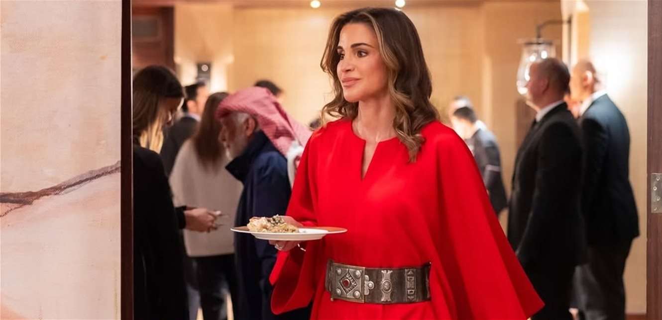 وظهرت الملكة رانيا بإطلالة راقية، حيث اختارت فستانًا ناعمًا باللون الأحمر بتصميم بسيط خالٍ من النقوش والتطريزات، تميّز بقصّة واسعة مع شق خفيف عند الرقبة وأكمام فضفاضة مستوحاة من تصميم العباءة، ما أضفى على الإطلالة طابعًا أنيقًا ينسجم مع الأجواء الرمضانية الروحانية.