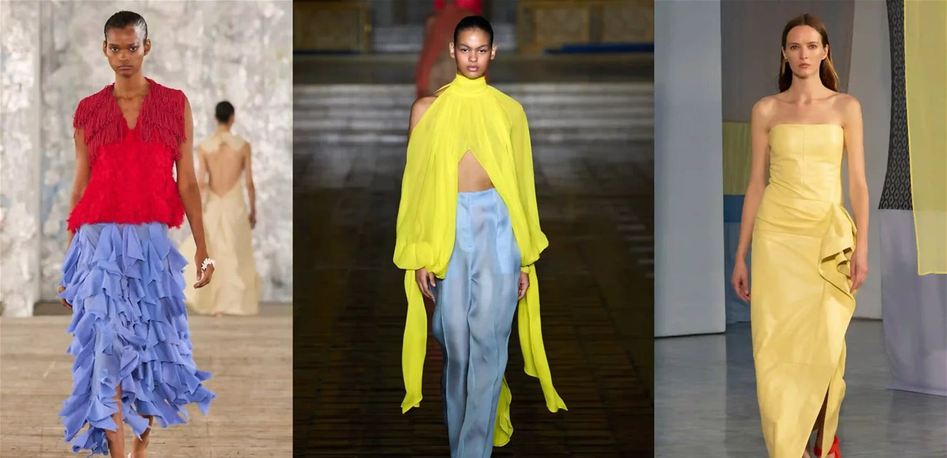 وأناقة في الوقت نفسه. كما تنتشر الألوان الزاهية والنقشات الحيوية مثل الورود، ما يضفي طابعًا منعشًا على الإطلالات.