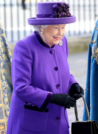 الملكة إليزابيت فضّلت أن تكون إطلالتها مختلفة حيث اعتمدت معطفاً باللون البنفسجي مع قبّعة بنفسجية اللون مزيّنة بالزهور.