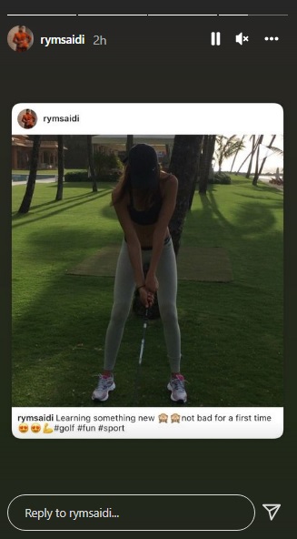 أعادت عارضة الازياء ريم السعيدي، زوجة الاعلامي وسام بريدي نشر فيديو قديم لها عبر خاصية "ستوري"، حيث كانت تلعب "الغولف"، بينما تلبس ثيابا رياضيّة مثيرة أظهرت قوامها.
