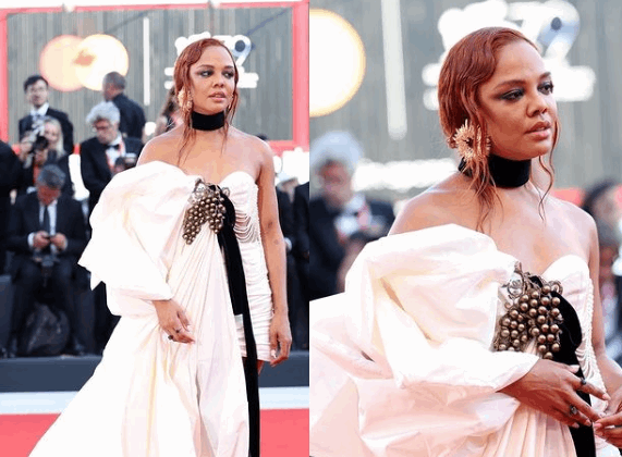 بعيداً عن الأسود، اختارت النجمة تيسا تومبسون Tessa Thompson فستان بتصميم غريب ولافت من توقيع دار سكياباريللي Schiaparelli