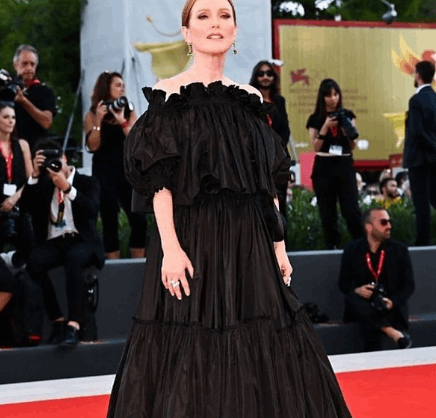 الأسود أيضاً كان خيار النجمة جوليان مور Julianne Moore التي ارتدت فستاناً بقصة أوف شولدر من توقيع دار كريستيان ديور Christian dior.