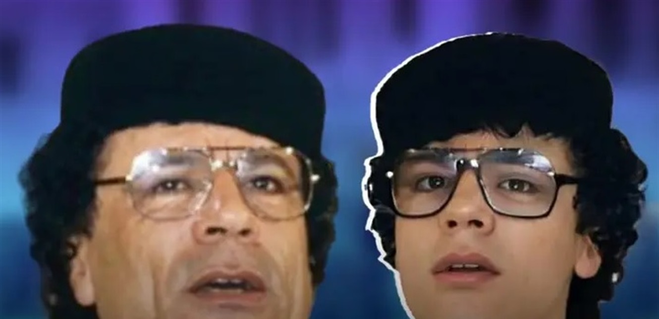 وبدا فيها فتى في العقد الثاني من العمر، يرتدي قبعة سوداء، تتشابه ملامحه مع ملامح القذافي.