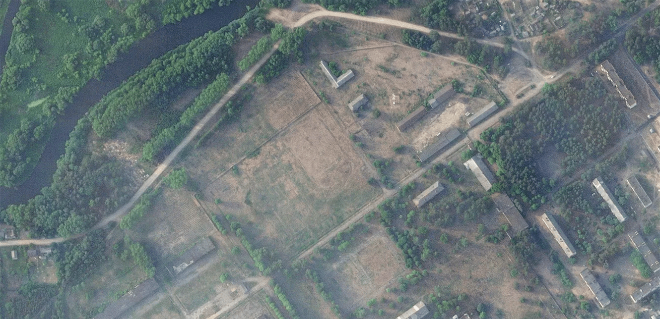 صورة قمر اصطناعي تم التقاطها في 15 حزيران لا تظهر أي علامة على وجود صفوف من الهياكل البيضاء والخضراء والتي يمكن رؤيتها بوضوح في صورة لاحقة بتاريخ 30 حزيران.