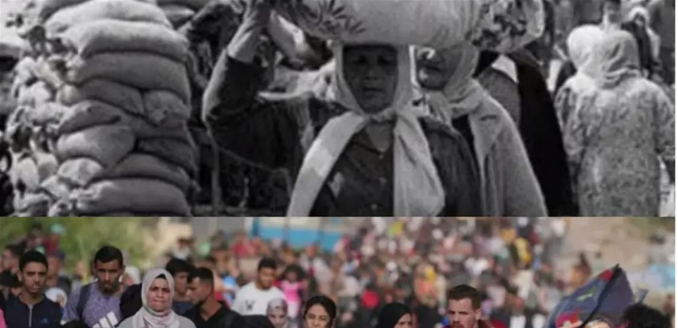 فالصورة الأولى بالأبيض والأسود، تعود لأيام "النكبة"، وهو مصطلح فلسطيني يعبر عن المأساة الإنسانية المتعلقة بتشريد عدد كبير من الشعب الفلسطيني خارج دياره عام 1948، حين طُرد