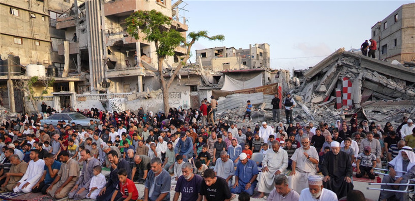 في ظل أوضاع إنسانية صعبة، تجمّع عشرات الفلسطينيين قرب أنقاض مسجد بمدينة خان يونس، لأداء صلاة عيد الأضحى، الذي تزامن حلوله مع الحرب الضارية في قطاع غزة، بين الجيش الإسرائيلي وحركة حماس.