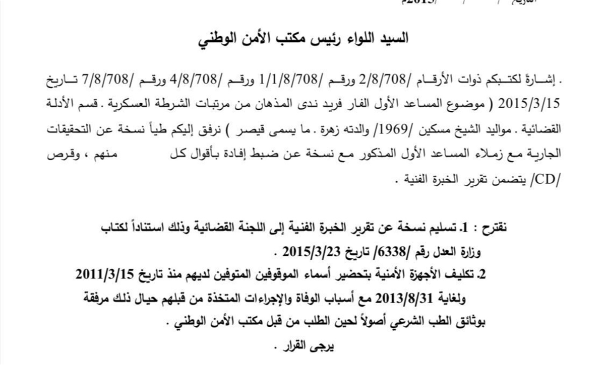 في الوثيقة، الصادرة في 2015 عن جهاز المخابرات الجوية وبعنوان "سري وفوري للغاية"، يرد اسم فريد ندى المذهان على أنه "قيصر".