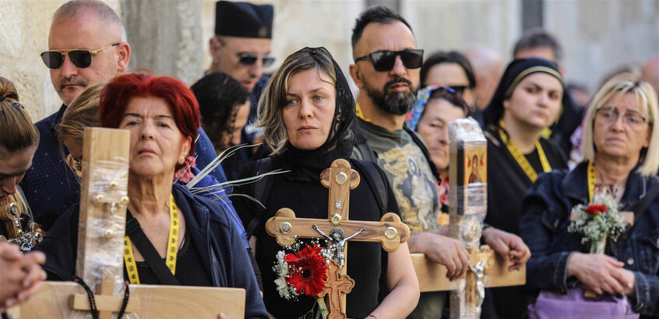 الأرثوذكس الذين تجمعوا في كنيسة القيامة في القدس، عن تمنياتهم بأن يسود السلام والمحبة على الأرض في يوم