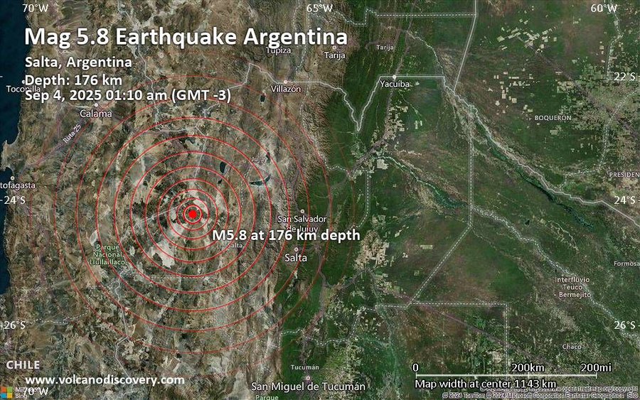 وبحسب المركز، وقع الزلزال على عمق 176 كيلومترًا، في منطقة تبعد 186 كيلومترًا غرب مدينة سالتا في الأرجنتين.