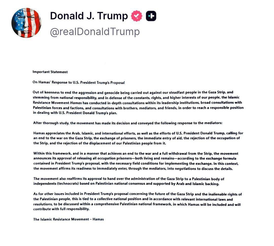 الرئيس الأميركي ترامب ينشر بيان حركة حماس المتضمن قبول خطته على حسابه في منصة تروث سوشال