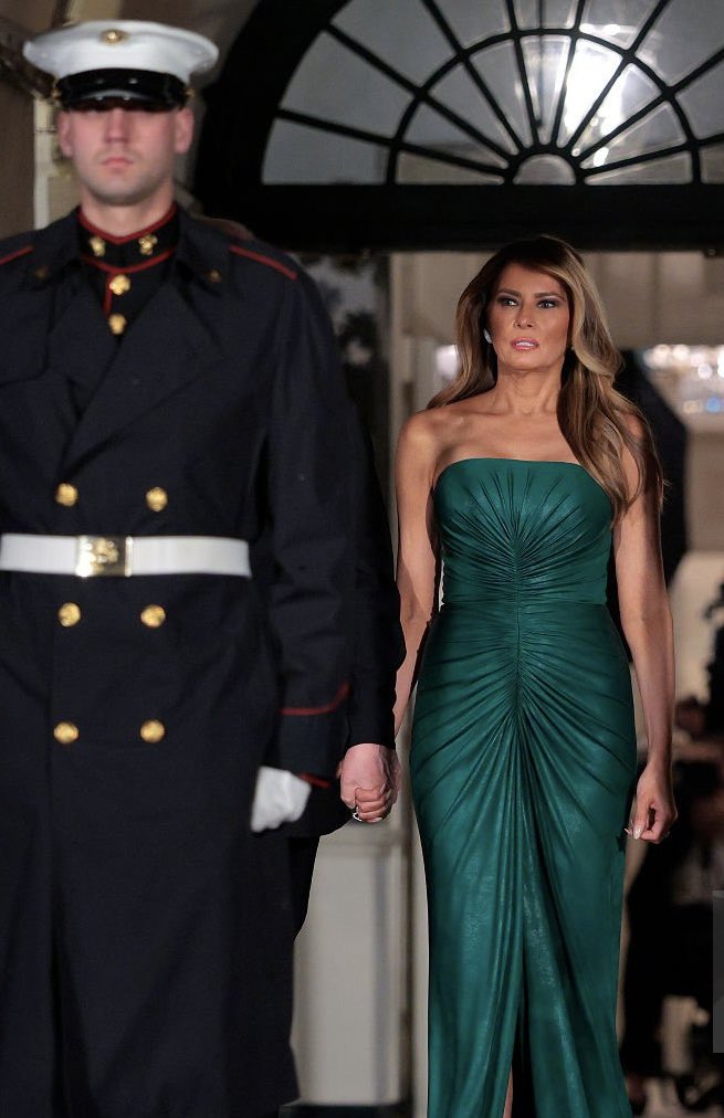 واختارت ميلانيا فستانا يتميّز بطياته الكثيفة وقماشه اللامع بلون أخضر داكن يُذكّر بلون