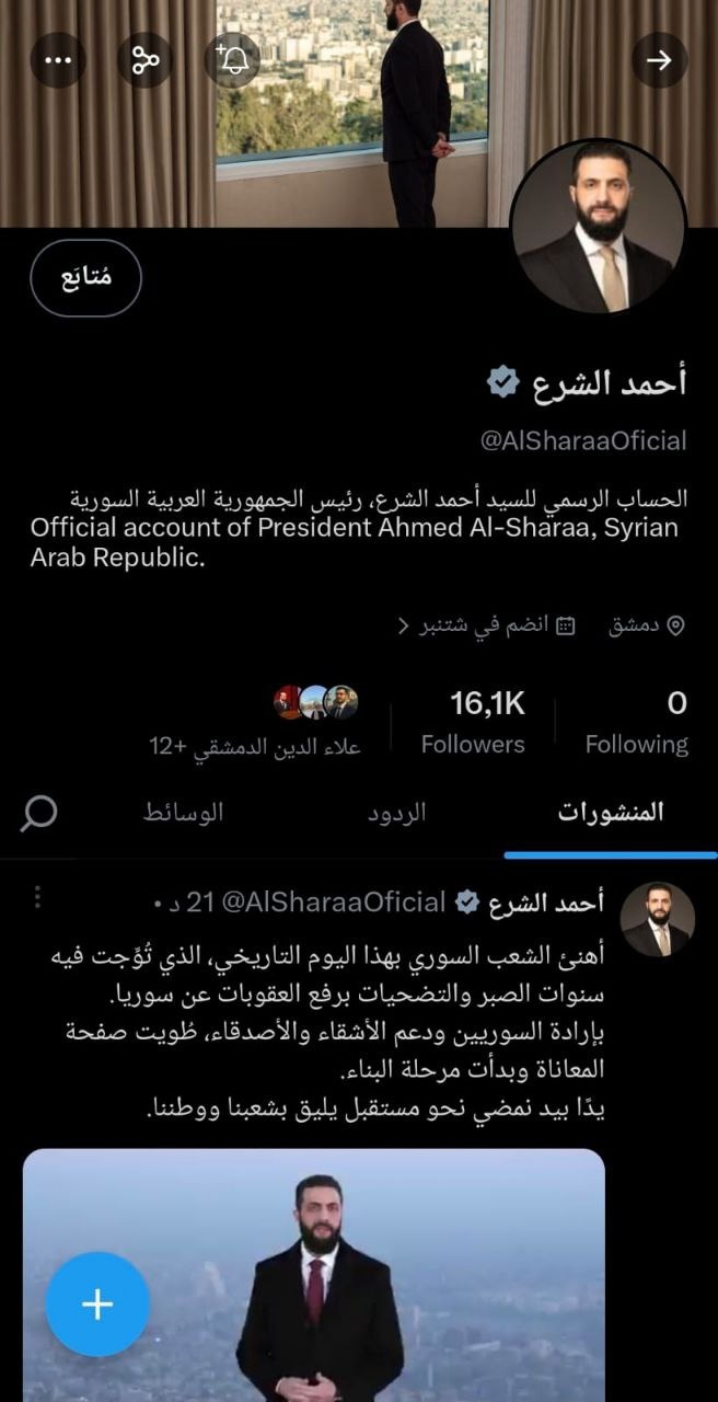 الشرع ينضم رسميًا إلى منصة "إكس"