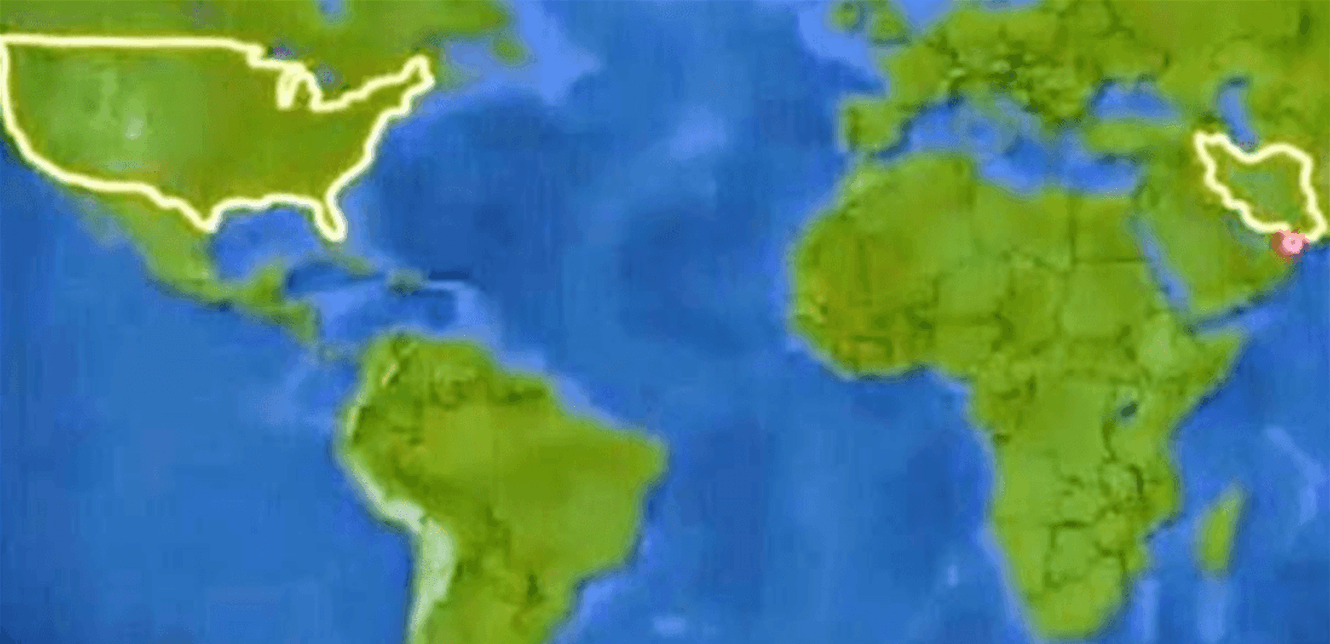 . على بعد محيطات عديدة، في الجانب الآخر من الكرة الأرضية، حدود إيران محددة باللون الأصفر. الدائرة الصغيرة باللون الأحمر هي مضيق هرمز". (سكاي نيوز)