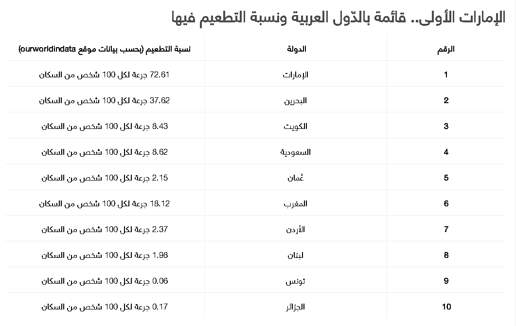 ووفقاً لموقع "ourworldindata" المتخصص في مجال البيانات، فإن الإمَارات جاءت في طليعة الدولة العربية بمجال التطعيم، إذ وزّعت لقاحات بمعدل 72.61 جرعة لكل 100 شخص، وهي نسبة تشيرُ إلى تقدّم الدولة في حربها ضدّ جائحة "كورونا".